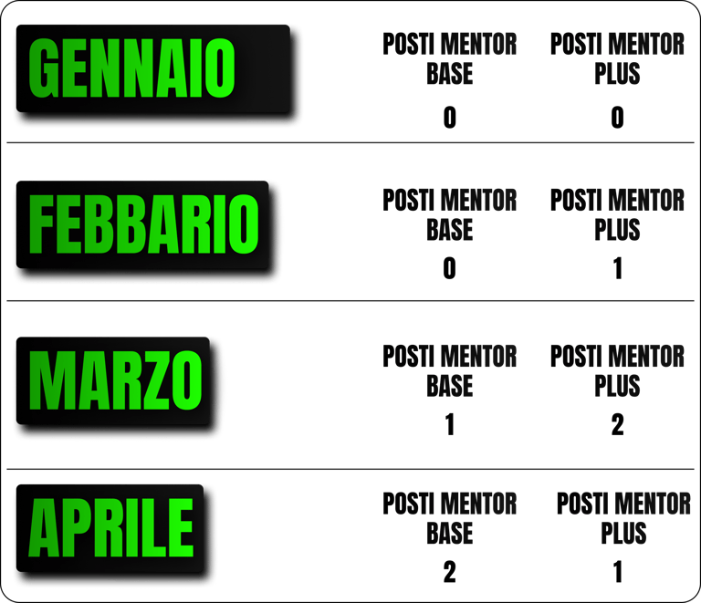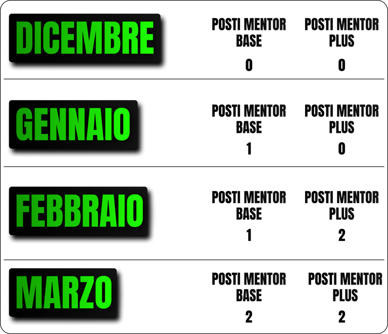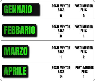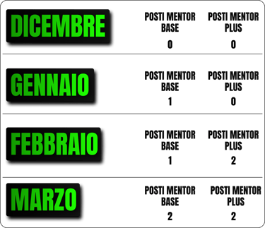 Mentor Base con lezioni a cadenza trisettimanale (ogni 20/25 giorni) adatto per chi desidera maggior tempo e preparazione tra una lezione e l’altra!